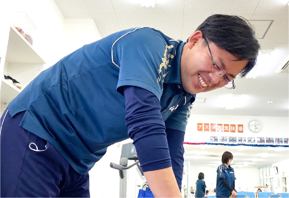 アスレヤマトの起ち上げ第1号として入職し、以降『デイフィットASRE和』でリハビリテーションやトレーニングサポートを行なっています。また現在は、介護事業部の責任者として、各事業所のマネジメント業務や、後輩職員の方々のサポートを行なっています。