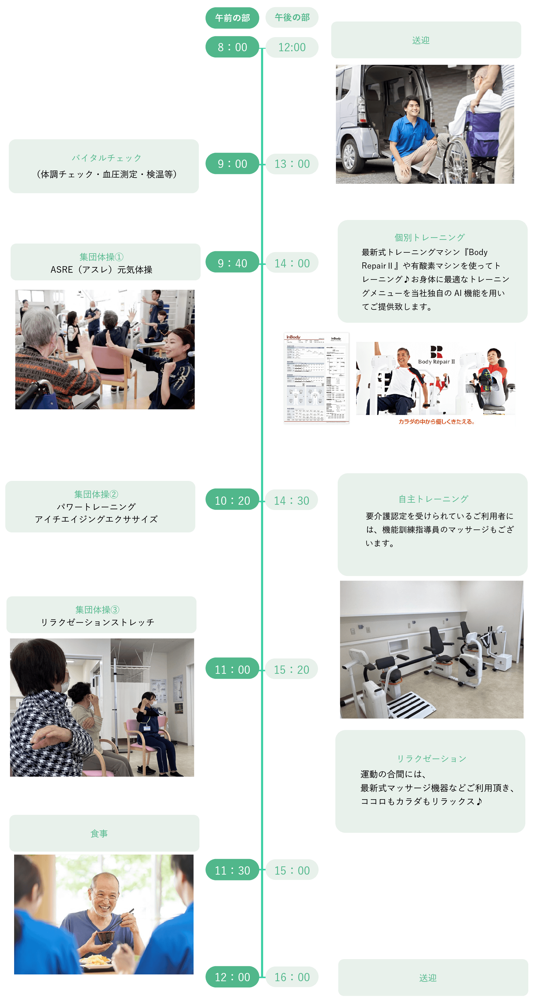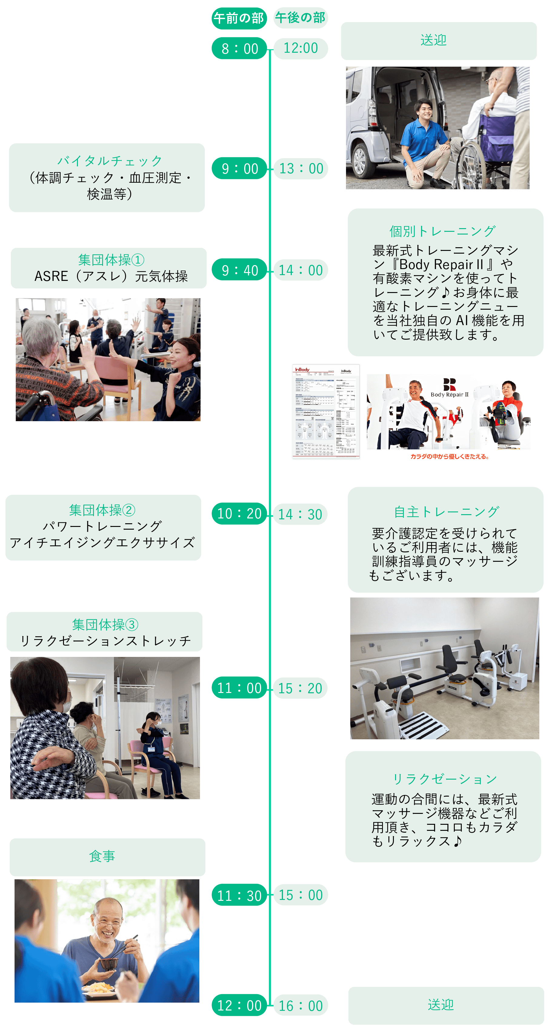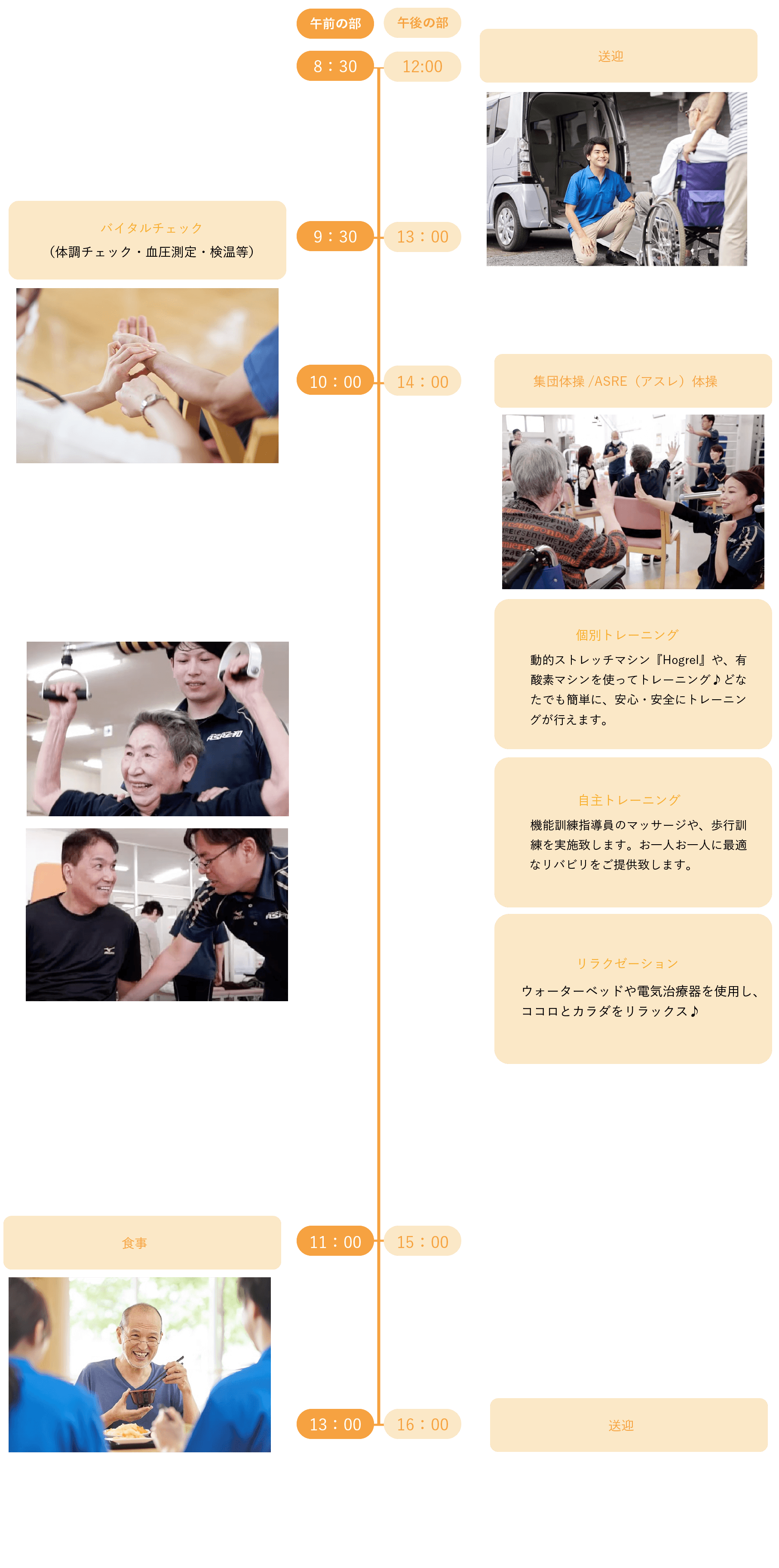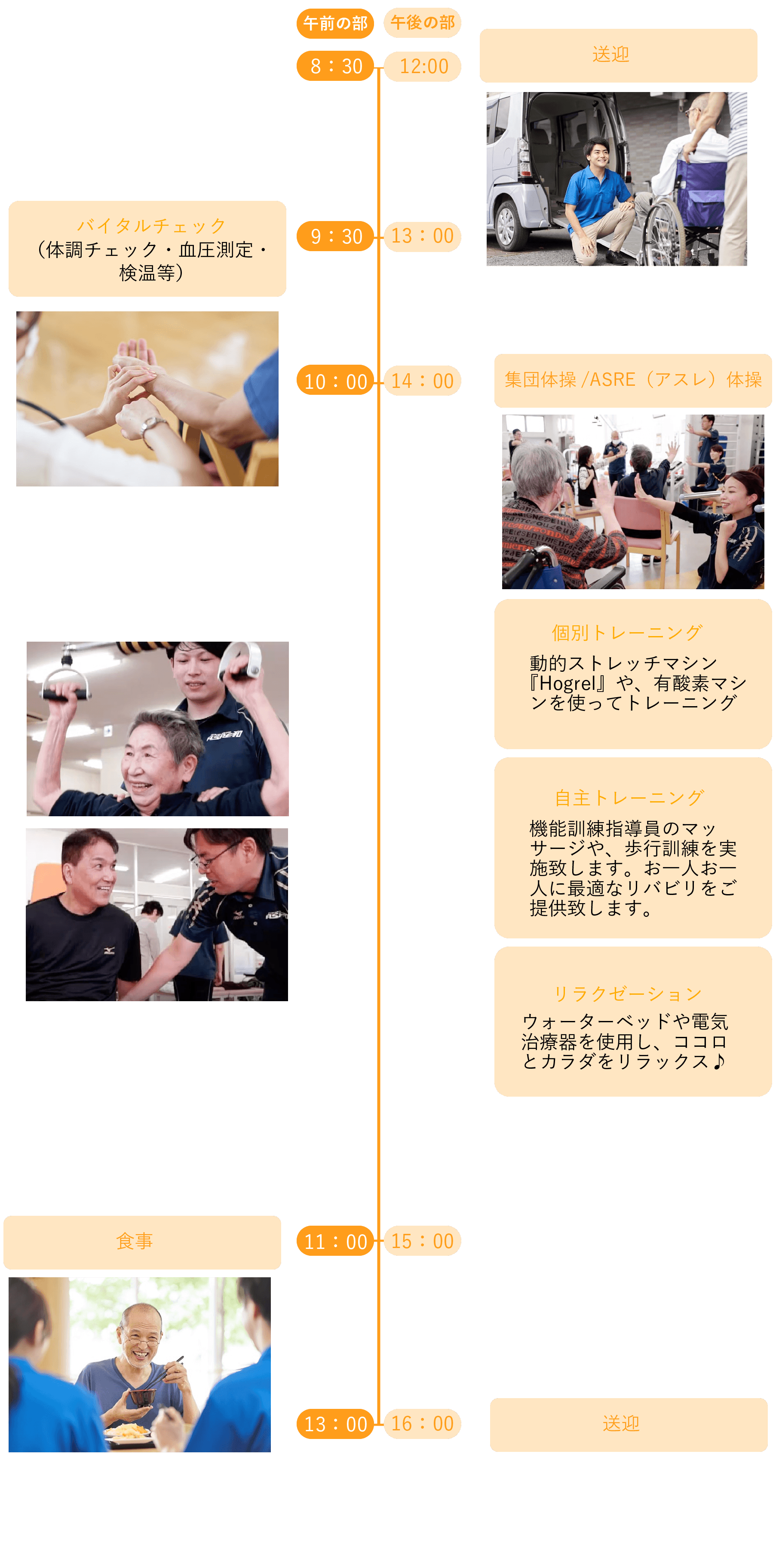 - ※上記提供時間は、およその目安時間となります。送迎状況や当日のご利用者様の人数により、多少前後することがあります。